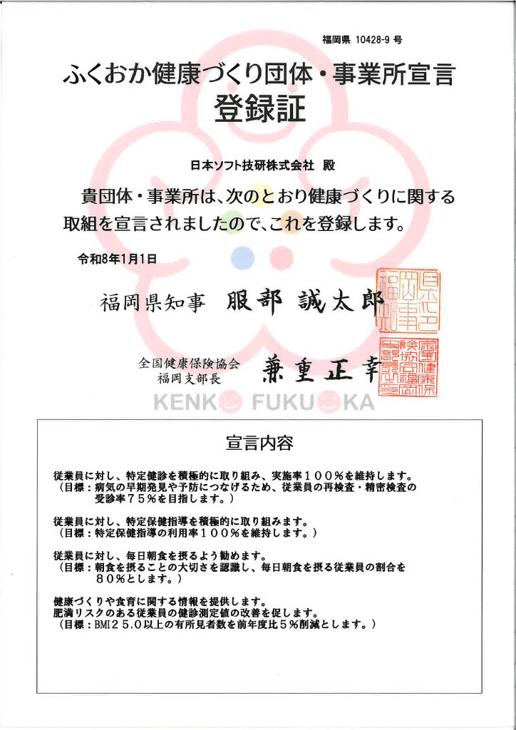 弊社は、健康経営への取り組みの一環として、健康宣言を登録いたしました。